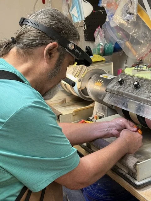 David Anderson is a lapidary artist based at Cottonwood Center for the Arts in Colorado Springs, CO. He shares a studio with his wife, Karen Anderson, and sister-in-law, Debra Box, both accomplished artists in their own right. David specializes in teaching students the fundamentals of transforming rough stone into beautifully finished cabochons, known for his signature high-polish finish.